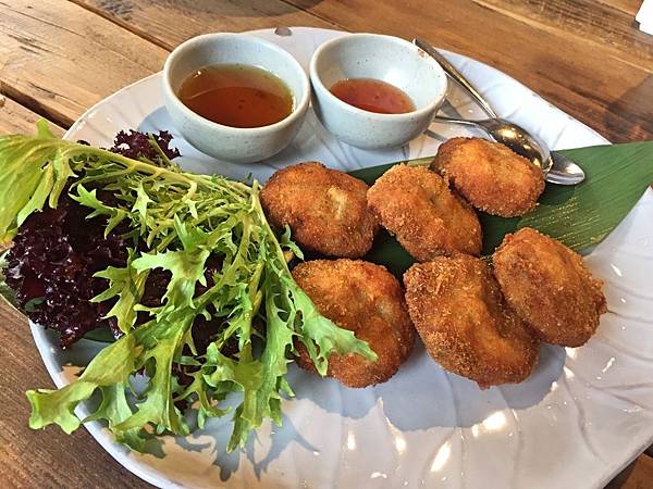 金錢蝦餅,沾醬給了梅子醬和辣雞醬兩種,都是酸甜滋味。然後蝦餅總共6顆,是小而美的型態,外表略酥且能吃到蝦肉,口感些微紮實,還可以。