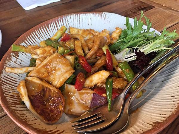 清邁鹹蛋黃炒中卷,這個就是金沙中卷,鹹蛋黃著實地扒附在中卷上頭,每咬一下都是滿滿的沙沙口感,味道很好,只是中卷口感過軟,沒什麼咬勁,可惜了這個均衡調味。