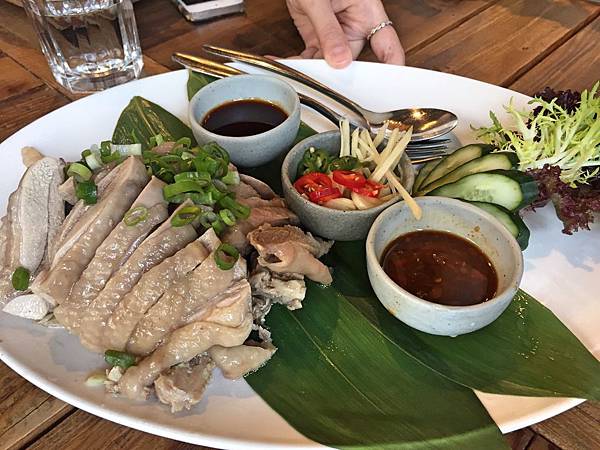 海南雞肉盤,同樣給了兩種沾醬,一個類似蠔油膏,另一個就是酸甜味。然後雞肉口感有嚼勁,皮Q鮮嫩,算不錯吃,但一半是有骨頭的。