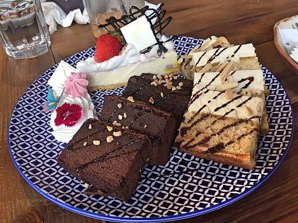 精緻甜點,這是飯後送上的甜點,有輕乳酪、布朗尼和胡蘿蔔蛋糕,每個都很普通,倒不如給有南洋特色的摩摩喳喳或者芋頭西米露來得恰當。且整個用完餐之後覺得價格頗高,但餐點水準卻跟不上,看來只能淪落為拍照打卡用的一次店了。