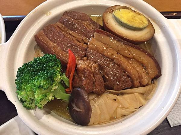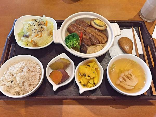樹子筍乾焢五花,配菜很精緻,有百香果醬佐涼拌青芒果、清炒高麗菜和地瓜,以及一碗菇菇湯。其中芒果酸甜開胃,又帶點脆口感,可以解掉主食焢肉的油膩。高麗菜味道則是很足,是爽脆的口感,蠻好吃的,而菇菇湯清淡味鮮,還可以。最後當甜點的地瓜,口感綿密香甜,非常美味,不愧是當地的特產。另外主食五花肉還給了筍乾、半顆滷蛋、香菇和花椰菜,整個套餐菜色非常豐富。然後五花肉肥而不膩,且醬油有吃進去肉裡,可惜鹹香氣息沒有出來,至於瘦肉部分,口感絲絲分明不乾柴,只是整個五花肉顯得油了點,可能下面湯汁殘存太多油脂的關係。