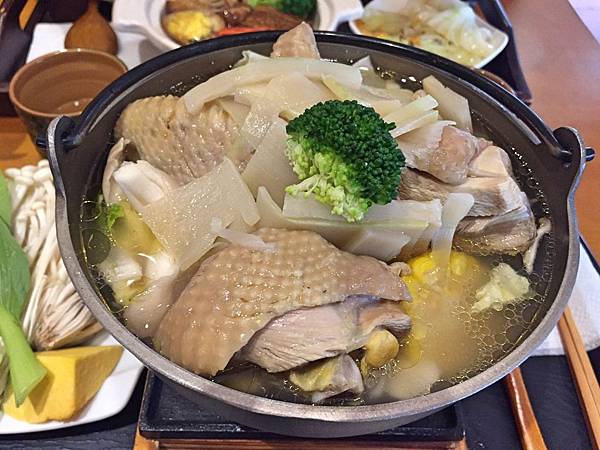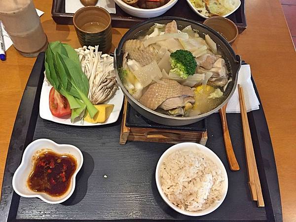 招牌醬筍土雞鍋,首先火鍋配料沒有多餘的一般免洗火鍋料,都是以菜類為主。然後湯頭喝起來是筍子的酸V阿酸V味道,調味頗為均衡,很好喝。而鍋底給了不少高麗菜和菇類來增加口感跟甜味,且還能吃到軟爛香甜的地瓜,竹山地瓜真的挺不賴。最後土雞肉質緊實,咬起來非常有嚼勁,可惜量有點少,另外沾醬味道和湯頭重複了,雖然還放了沙茶,但瑕不掩瑜,這鍋土雞仍舊很好吃。