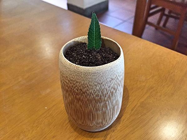盆栽蛋糕,同樣是套餐甜點,上面灑的是巧克力碎片,咬起來脆脆的,底層則是海綿蛋糕,扎實卻顯乾。而中間夾層的地瓜卡士達沒有什麼地瓜味道,還是以奶油為主。
