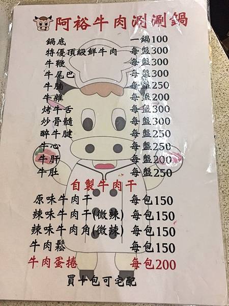 菜單品項以火鍋類的為主,其他較為特別的則有烤牛舌、炒骨髓和醉牛腱。