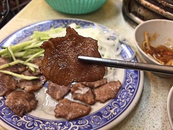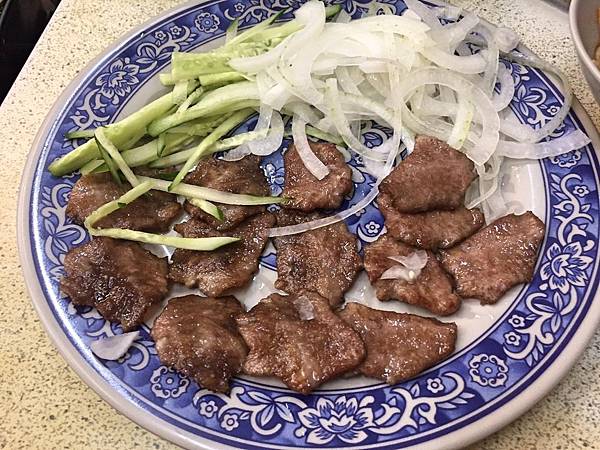 烤牛舌,還蠻小片的,吃起來有燒烤過的香氣和些許牛鮮味,且搭配的洋蔥絲和小黃瓜最好不要加進來一起食用,因為會有搶味的嫌疑。