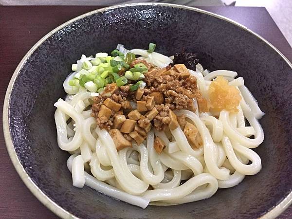 蒜泥炸醬烏龍麵,雖然有蒜泥,但味道不重,主要還是鹹香的炸醬來撐場面,且每條烏龍麵都能充分地扒附上醬汁,還能吃到豆干和肉末,不錯吃,但缺點都是相同。