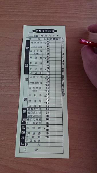 桌上有紙本菜單可以勾選,麵類選擇性算多,且餛飩湯還特別註明是里港餛飩,這樣就不用大老遠跑到里港吃了。