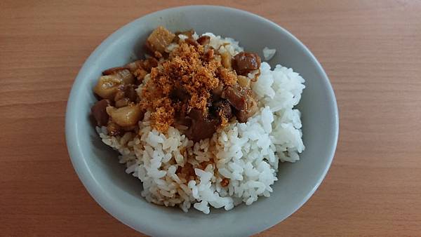 肉燥飯,飯粒乾爽,是適合淋醬的狀態,然後肉燥以肥肉居多,所以有微微的油脂黏稠感,可惜鹹度略淡,肉鬆又給太少,沒有甜度支援還是有些許落差。