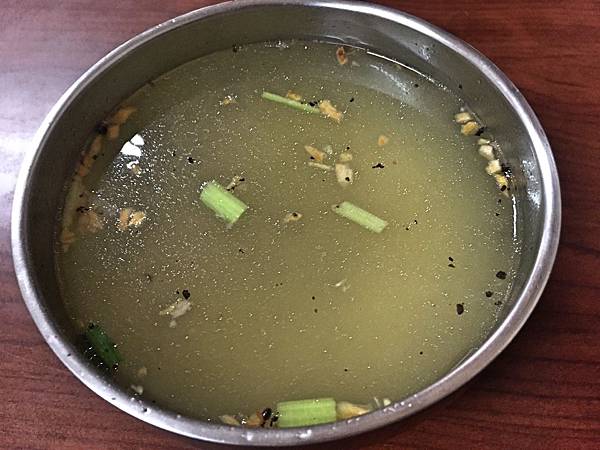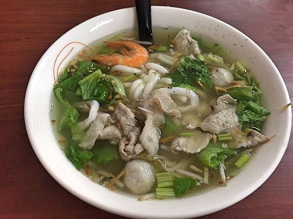 海鮮米苔目,很久沒吃到米苔目了就點來嚐鮮看看,首先湯頭喝起來清甜鮮美,有著油蔥酥香氣,加點桌上的檸檬汁更是對味。而米苔目口感滑溜有咬勁,不錯吃。然後配料給了豬肉片、青菜、丸子、小卷和蝦子,普通卻實在,還算可以。