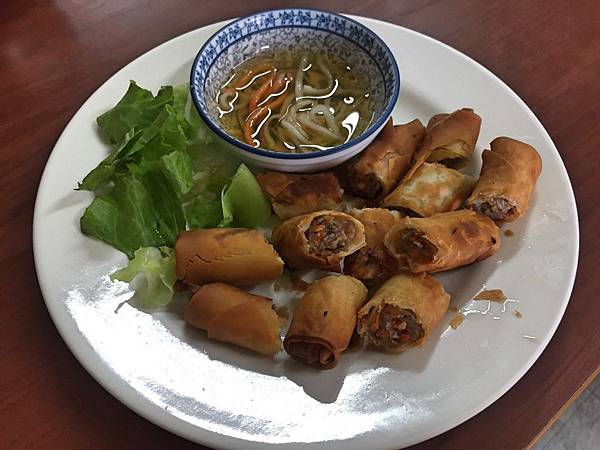 炸春捲,每次吃越南料理都會點這道來品嚐看看,店家炸春捲比較小條,內餡包裹著不少肉末,吃起來挺軟實的,加上外皮頗為酥脆,口感彼此交錯再沾點酸甜醬料,讓整體異國風味更加顯明。