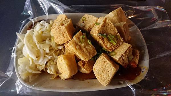 臭豆腐(大),這份50元,份量蠻多的,然後臭豆腐被裁切成剛好一口的份量,外層酥脆度普通,但不過硬。而臭豆腐裡頭鮮嫩空透,很容易吸取醬汁進去,且吃起來沒有油耗味,還不錯,唯一可惜的地方是這臭豆腐不夠臭。至於調味醬汁清爽微甜,有辣椒和蒜泥的輔助更是合搭,另外店家泡菜酸甜度很入味,任何一點蔬菜生味都沒有,咬起來清脆爽口,讓我很尬意。
