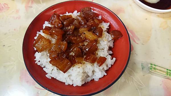 肉燥飯(小),肉燥以肥肉為主,但吃起來有點Q彈,不是軟爛的。而調味鹹香十足,帶點甜度,挺下飯的味道。