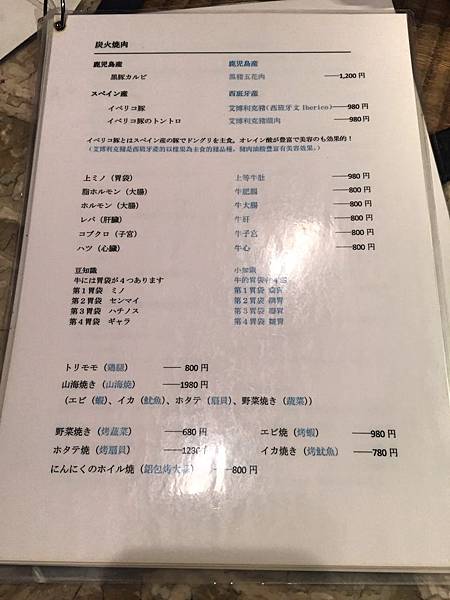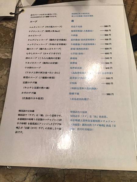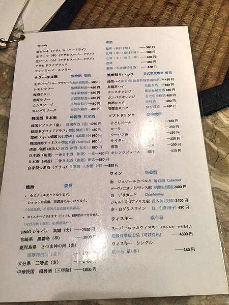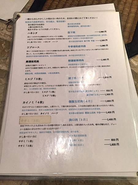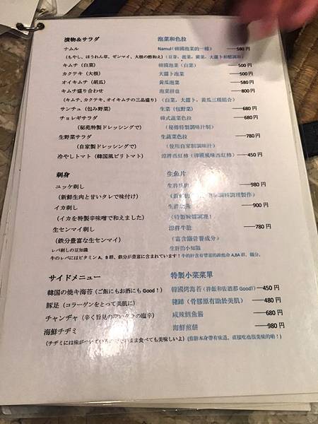 菜單厚厚一疊,品項非常多樣化,基本的和牛部位、特殊的牛內臟、豬肉、海鮮、湯品、醃漬物、刺身、飲料和各種飯麵類,可說是應有盡有,甚至夾雜了不少韓式料理在裡頭,讓人好難抉擇。