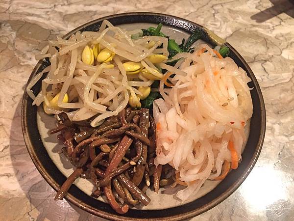 小菜拼盤,本想點韓式泡菜來中和油膩感,卻沒看清楚菜單上的內容物組成,就變成了這道綜合小菜。而這裡頭有豆芽菜、波菜、蕨菜和蘿蔔,軟脆口感兼具,吃起來是酸甜滋味,還是有達到解膩效果。