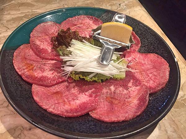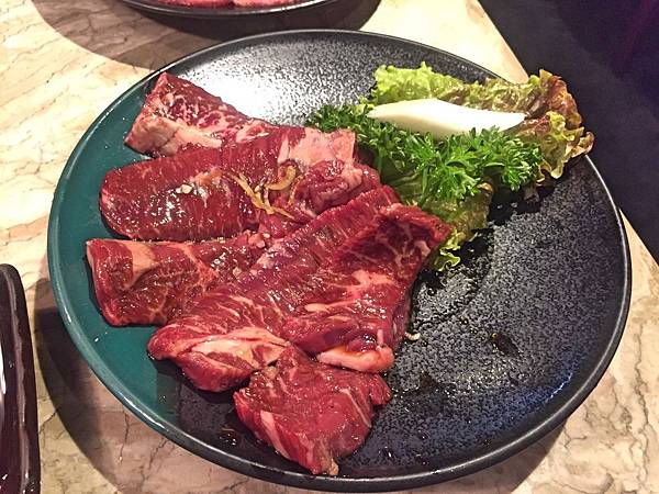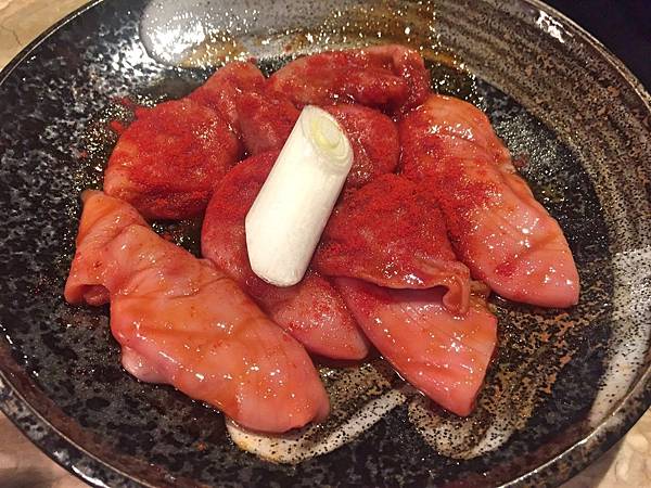 牛子宮,是我們第一次在燒肉店看到的部位,所以還特別加點來嚐試。而這乍看之下有點像豬的生腸,畢竟都是同樣部位,只是牛子宮比較大,咬起來脆口感特高,但內臟騷味也較重了些,難怪店家會使用含辣的香辛料下去壓味,只能說有吃過就好,並不是我們喜歡的菜。