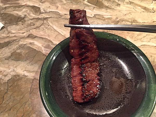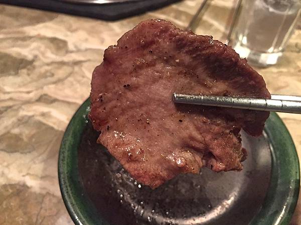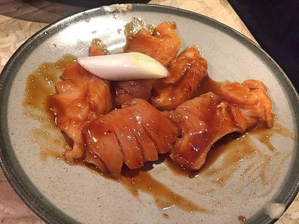 牛橫膈膜,少見的部位就點來試吃看看,沒想到讓人有眼睛一亮的感覺。這橫膈膜烤過之後,口感富有嚼勁,肉汁極多,且店家有稍微醃漬過,所以非常下飯,值得點來嚐鮮一下。