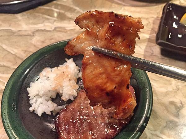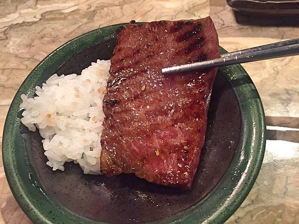 側腹五花肉,重頭戲來了,店家高單價的和牛部位我們挑選了一種來吃,就是這個牛五花肉。光看牛肉油脂分布就可以得知它實在非同凡響,翻烤過程不用太久,大概3~5分熟度是最佳狀態。吃進口中油脂馬上迸發出來,滿嘴香甜,口感軟嫩俱備,還保有些微肉質嚼感,非常好吃。尤其牛肉肉汁鮮甜和油脂香味混合著白飯一起食用,簡直是使人飄飄欲仙,欲罷不能,真不愧是極品的黑毛和牛部位。就算我正在打這一段感想,還是能回味起當初吃下去的口感和味道,讓人難以忘懷,恨不得立刻再殺去日本好好大吃特吃。