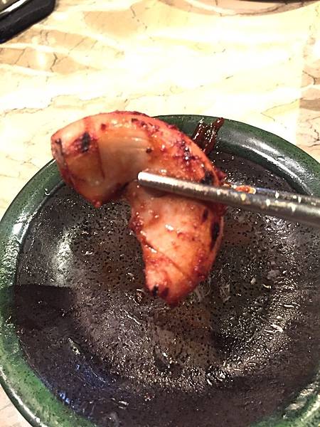 上等牛肚,原來是牛的胃袋,難怪和我們常見的牛肚長得不太一樣。然後店家有事前醃漬過,不需任何沾醬就很夠味,而口感較為厚實,咀嚼度大增,還帶點些微脆勁。另外盤子上附搭的大蔥也可以下爐翻烤,兩邊焦黃就可以食用了,吃起來多汁也沒有青蔥嗆辣感,還挺不錯。