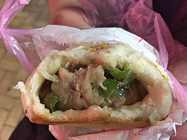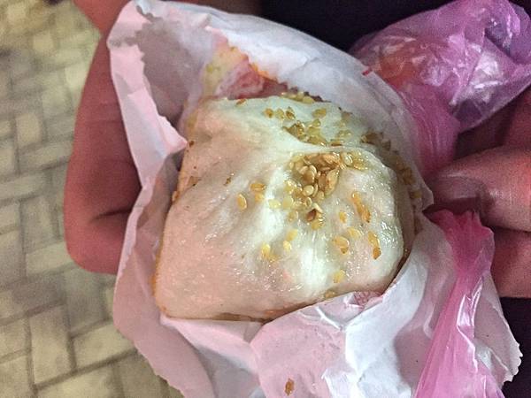 鮮肉包,外層全是白芝麻的就是基本口味鮮肉包了,裏頭僅包裹著蔥花和肉餡,而包子皮前面敘述過就不重複囉,直接從內餡說起。這餡料一咬下去馬上噴汁,肉汁非常豐富,還不小心沾到我的衣服,爆漿效果極佳。然後肉的鹹鮮味道頗為突出,只是油了點,但蠻好吃的。