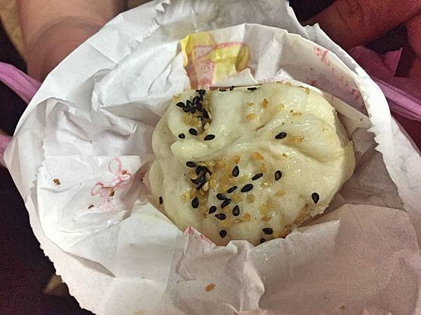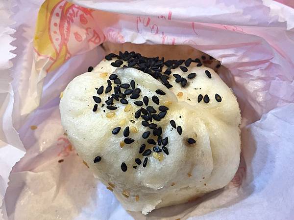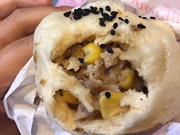 鮮肉玉米包,包子外皮撒上黑白芝麻,而黑芝麻多點的就是玉米包。然後包子皮咀嚼之下能品嚐到甜味,口感厚實有咬勁,另外玉米香甜肉餡鮮美,是個不錯的組合,可惜肉汁少了點。