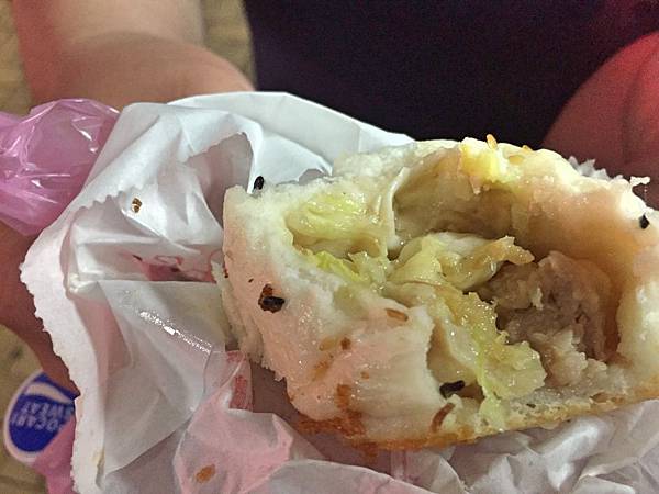 雙味包,外層同樣有黑白芝麻,數量明顯很均勻,這就是高麗菜肉包。滿滿的高麗菜在裡面,一咬下去水分極多,導致鮮度稍微被高麗菜給稀釋掉,但多了蔬菜的清甜味,而三種口味吃下來,個人比較喜歡原味的鮮肉包。