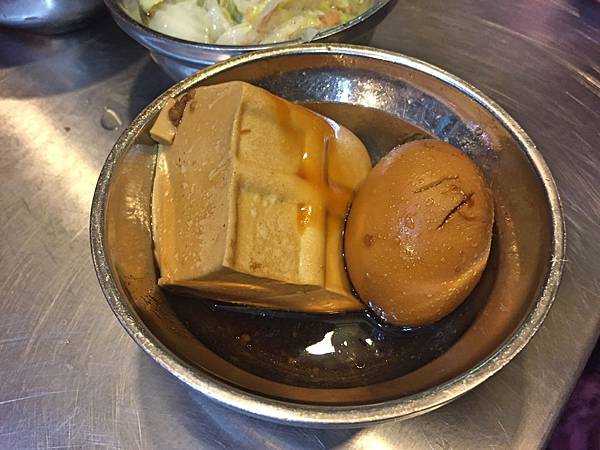滷豆腐和滷蛋,豆腐外層口感偏硬,內裡白皙如雪,要沾醬才夠味,幸好店家給的醬汁鹹度甚重,而滷蛋本身味道就有滷進去,所以單吃剛剛好。